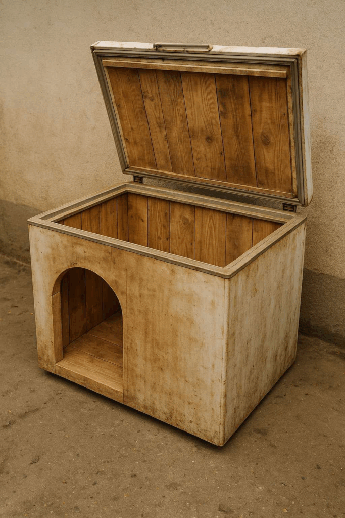 - fa ládából kialakított praktikus kutyaház és tároló,